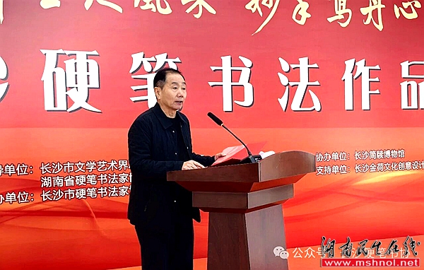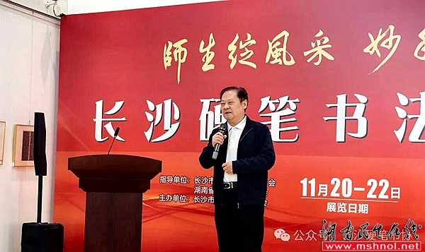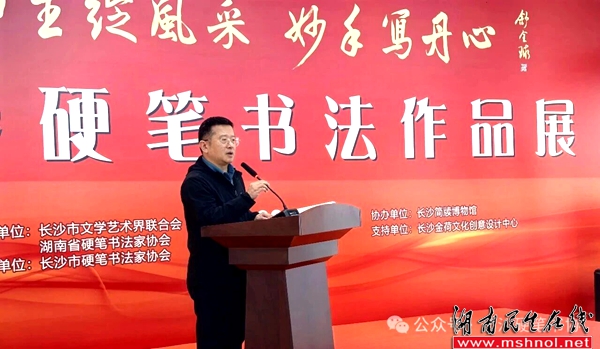 长沙市文联党组书记、主席舒全球在讲话中对长沙市硬笔书法家协会给予高度评价,称赞其活动丰富多样、有声有色,会员参与热情饱满。他特别肯定此次展览筹备扎实、宣传广泛,尤其认可“师生同展”的鲜明特色:“展览既汇聚了老师们的匠心之作,彰显教育工作者的文化担当,更收录了同学们的精心创作,展现出硬笔书法传承的蓬勃生机。”